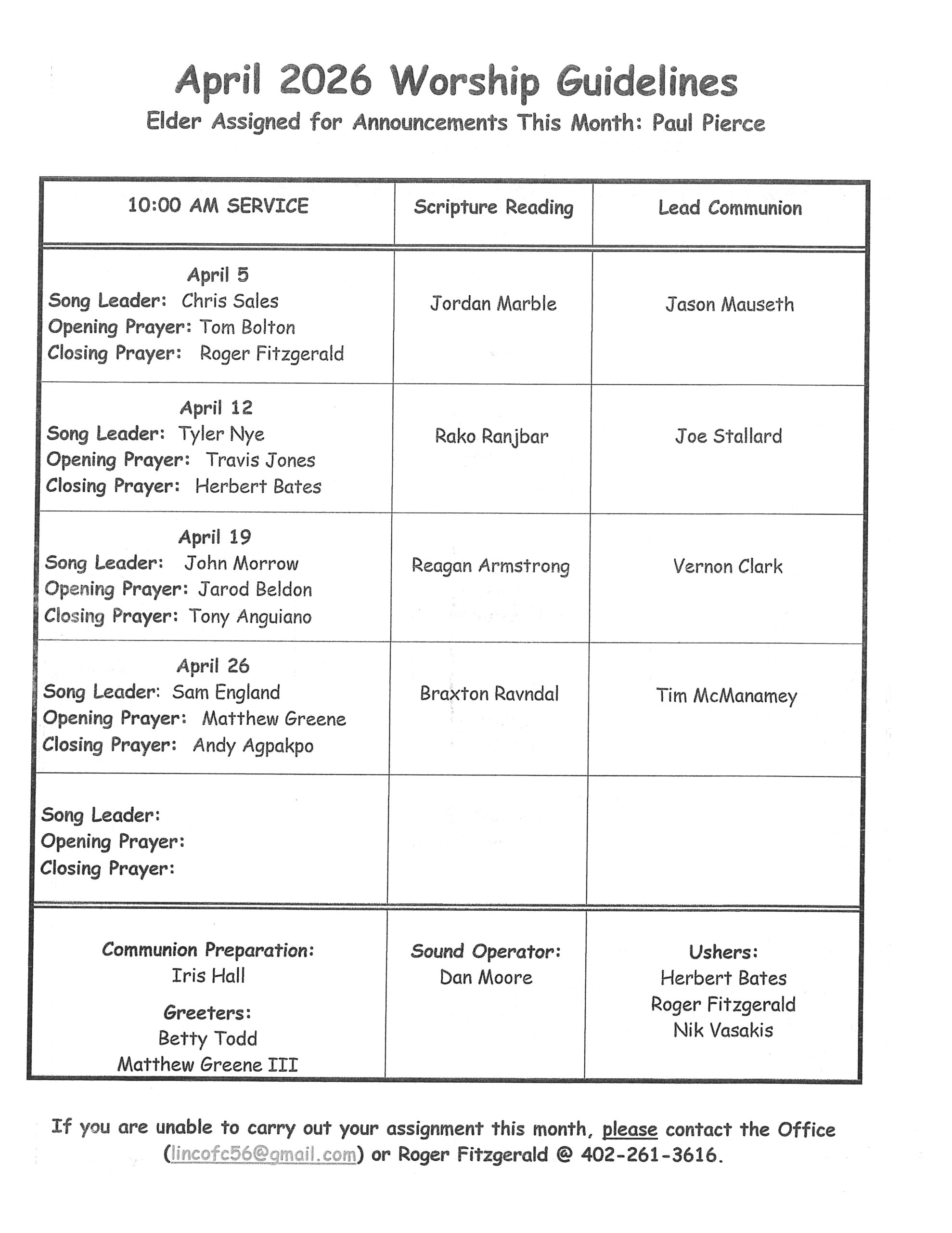 If unable to serve please contact Roger Fitzgerald or the church e-mail at: lincofc56@gmail.com